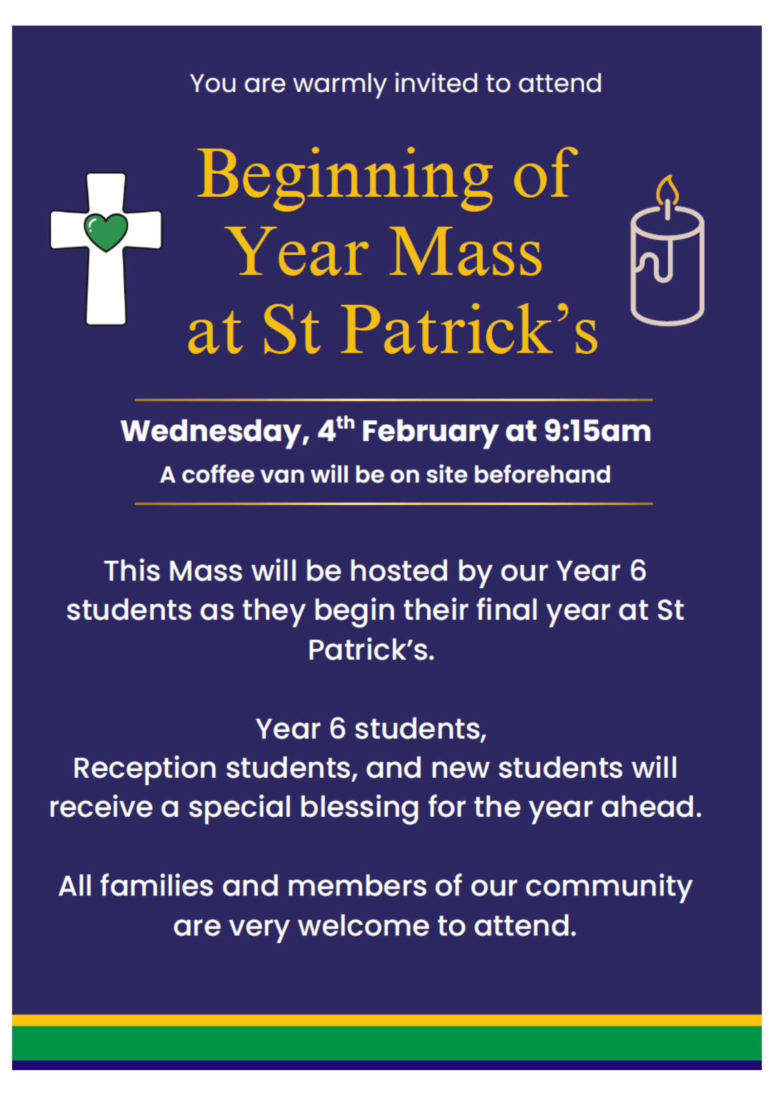 Our Beginning of Year Mass will be celebrated on Wednesday 4th February at 9:15am.