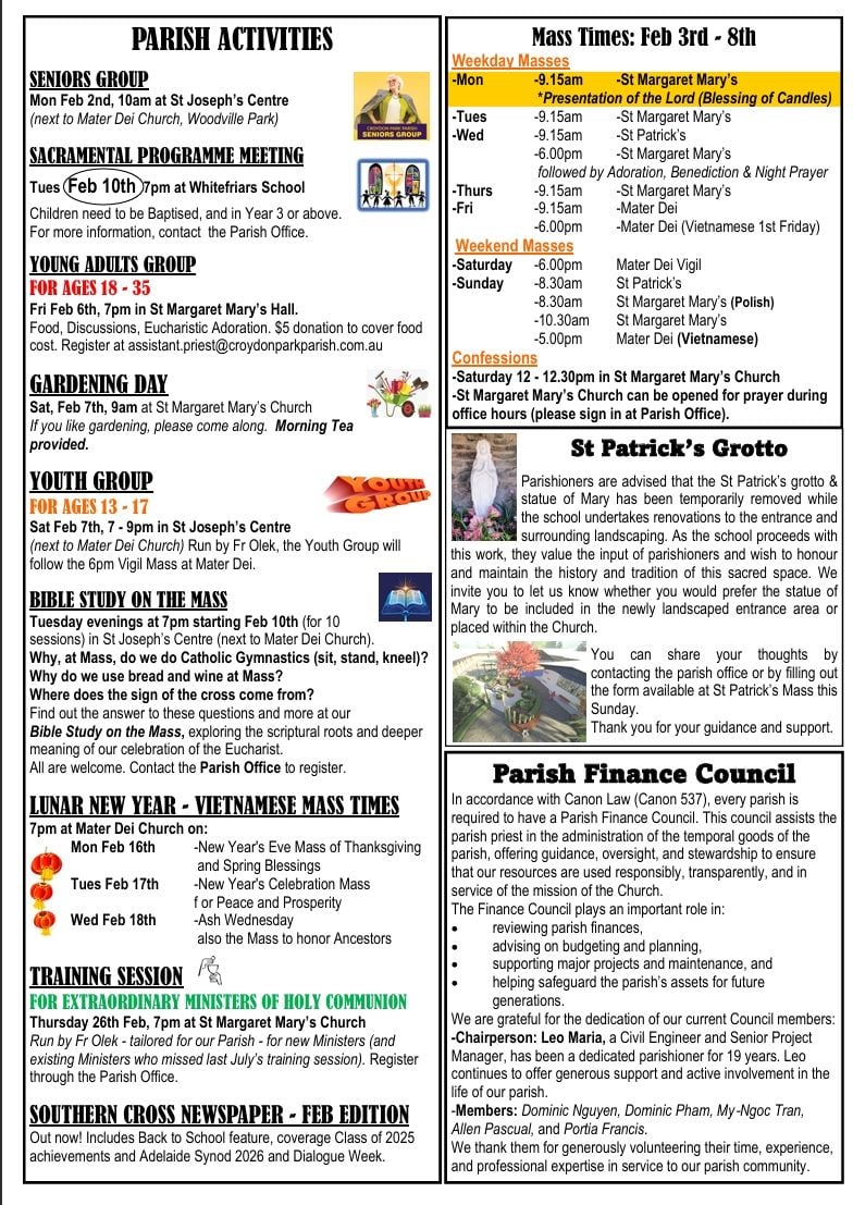 The St Patrick’s Grotto & Statue of Mary has been temporarily removed while the school undertakes renovations to the entrance and surrounding landscaping. As the school proceeds with this work, we value the input of parishioners and wish to honour and maintain the history and tradition of this sacred space. We invite you to let us know whether you would prefer the Statue of Mary to be included in the newly landscaped entrance area or placed within the Church. You can share your thoughts by contacting the parish office or by filling out the form available at St Patrick’s Mass this Sunday. Thank you for your guidance and support.