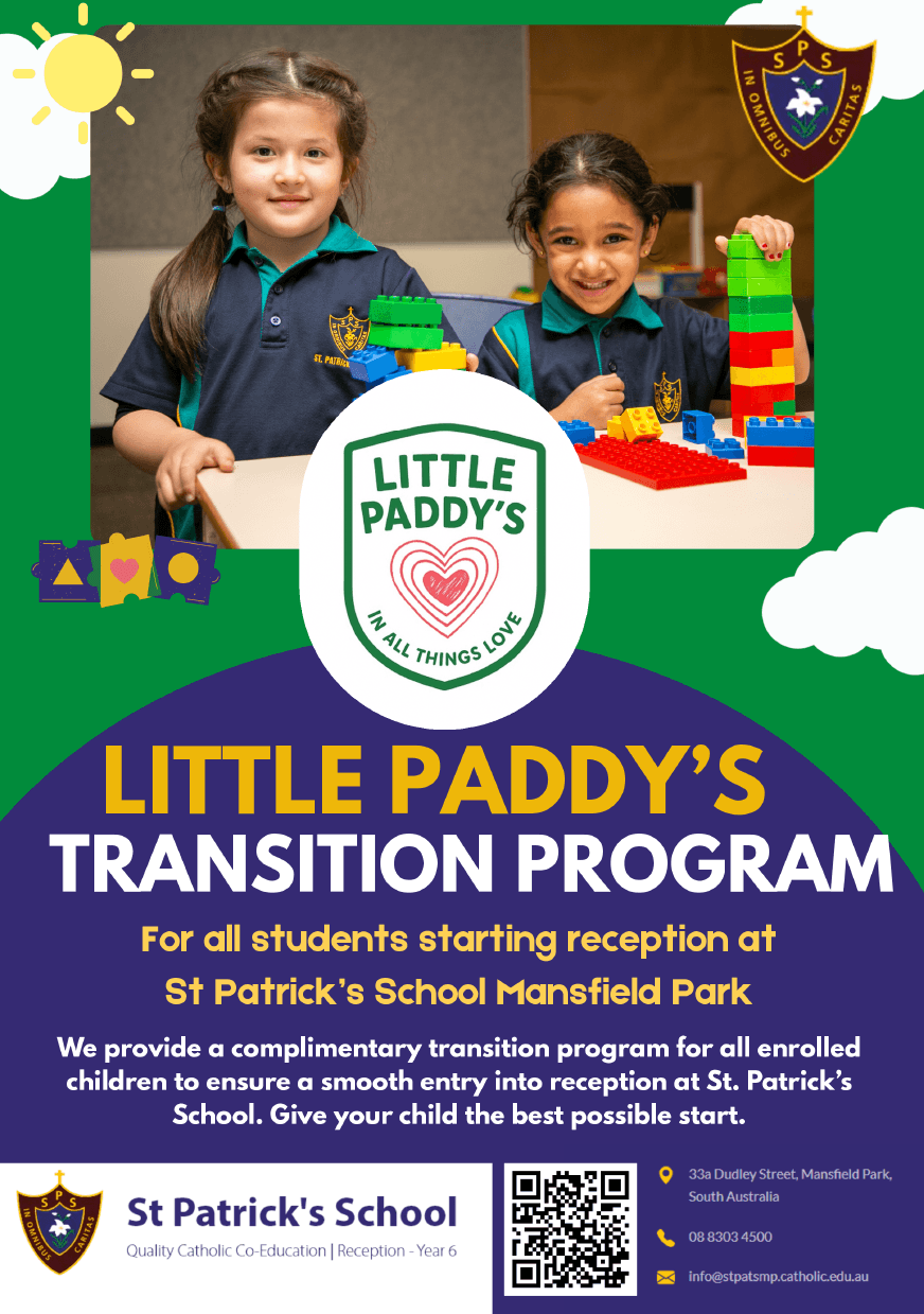 At St Patrick’s School Mansfield Park, we are proud to offer Little Paddy’s Transition Program—a complimentary and supportive introduction to school life for all children beginning Reception.