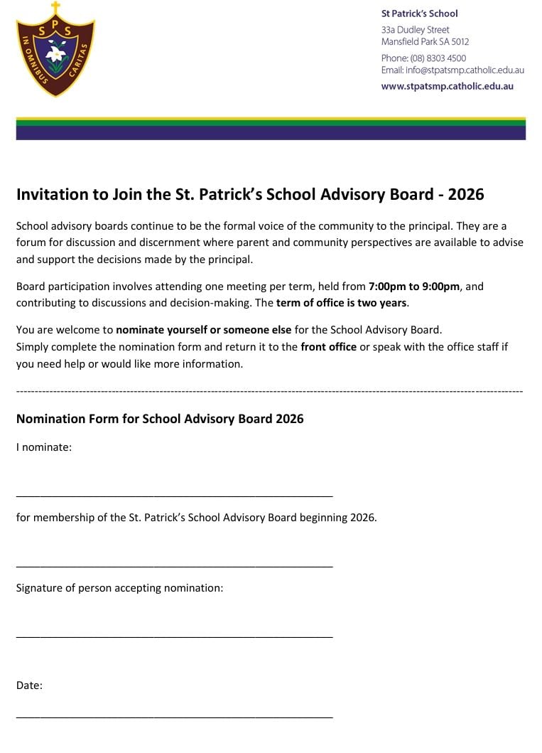 We acknowledge the contribution of the following School Advisory Board who served the school well during 2025: